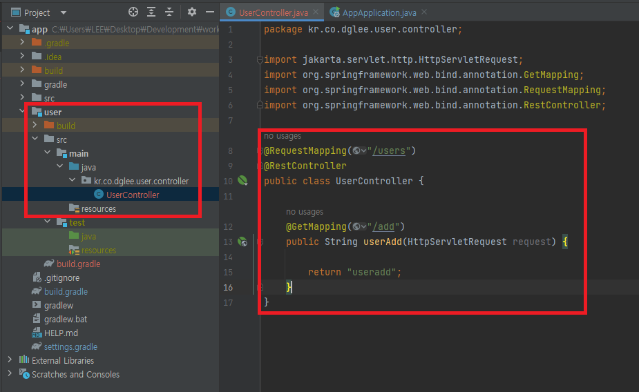 user 모듈의 패키지 구조는 kr.co.dglee.user 입니다.