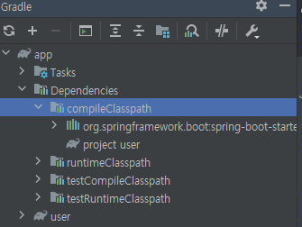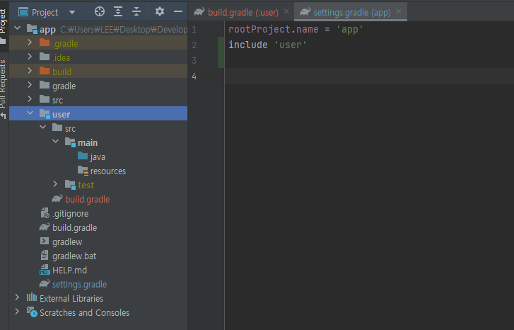 user 라는 소스 디렉토리가 생성되며, 루트 프로젝트(app)의 settings.gradle에는 include 'user'가 자동으로 입력된다.