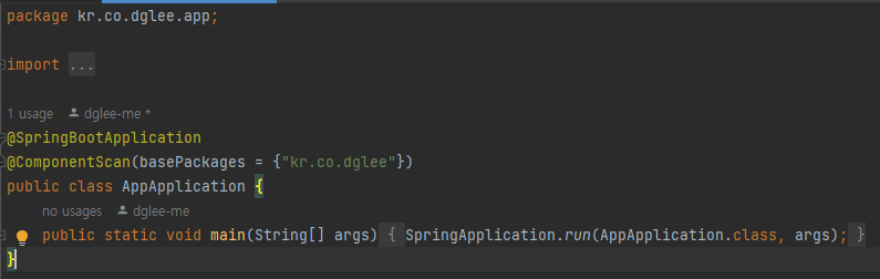 차후, user 말고도 admin, board, etc...가 추가될 수 있으니 @ComponentScan의 pakcage를 kr.co.dglee로 시작하는 모든 패키지를 검색할 수 있도록 설정해줍니다.