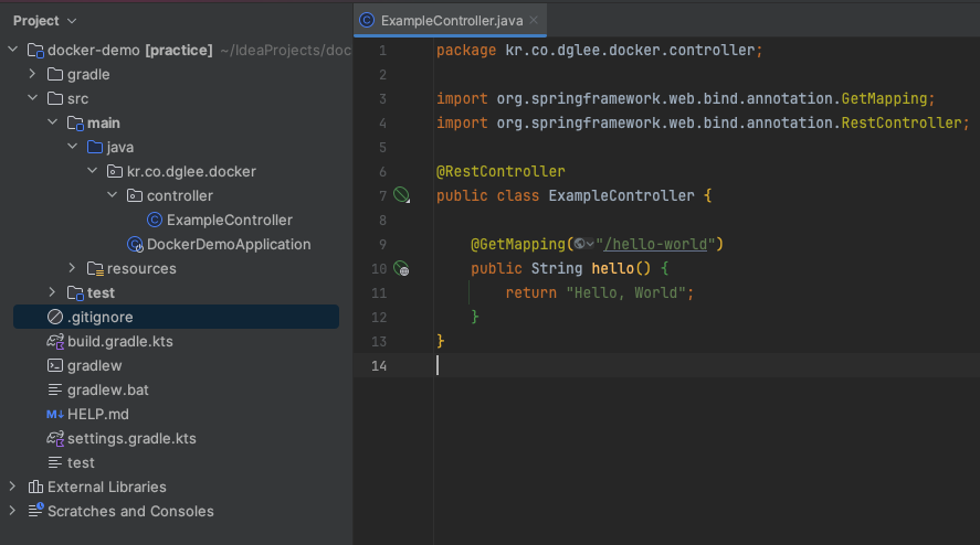 가볍게 /hello-world 으로 접근하면 "Hello, World!" 를 반환하는 컨트롤러를 생성해줍니다.