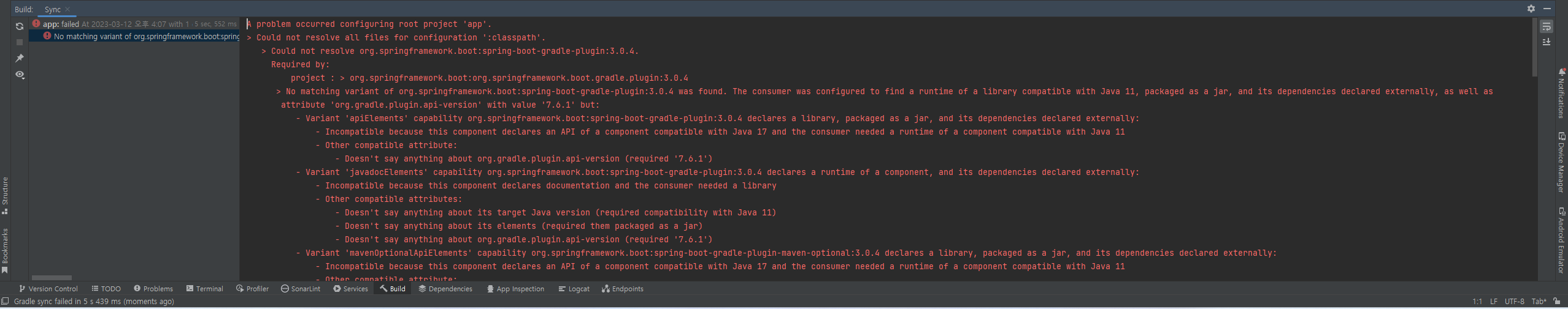 > No matching variant of org.springframework.boot:spring-boot-gradle-plugin:3.0.4 was found. The consumer was configured to find a runtime of a library compatible with Java 11, packaged as a jar, and its dependencies declared externally, as well as attribute 'org.gradle.plugin.api-version' with value '7.6.1' but: