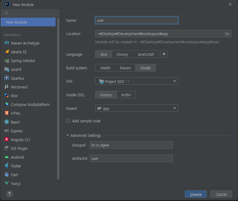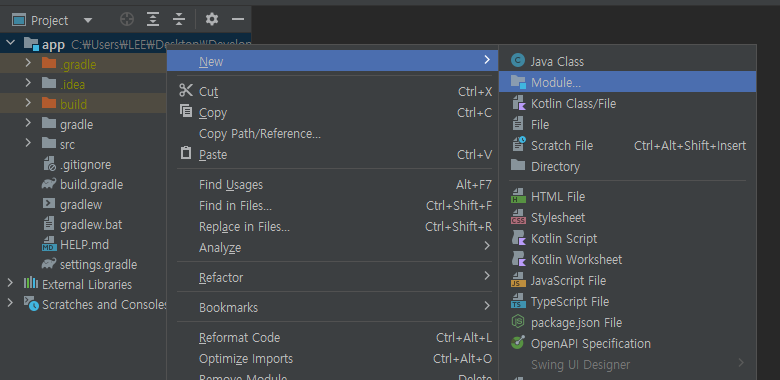 user 라는 소스 디렉토리가 생성되며, 루트 프로젝트(app)의 settings.gradle에는 include 'user'가 자동으로 입력된다.