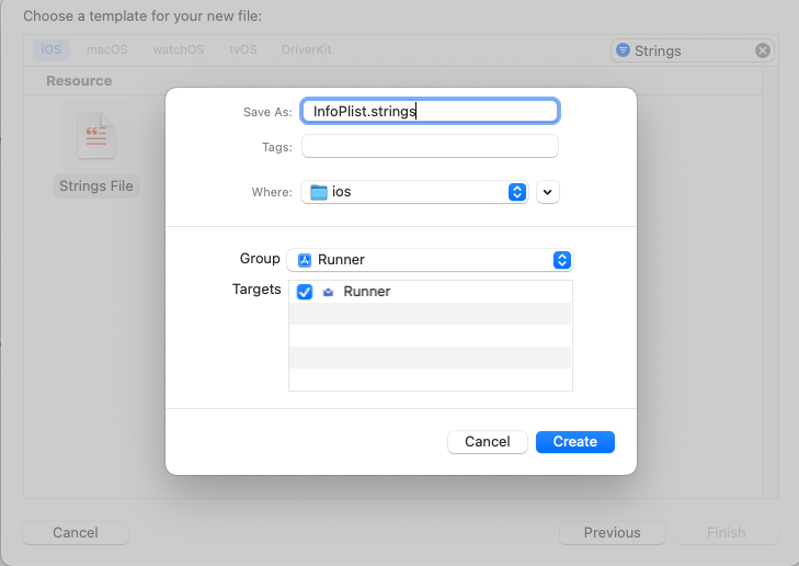 2. Strings File을 선택하여 InfoPlist.strings 이름으로 파일을 생성합니다.