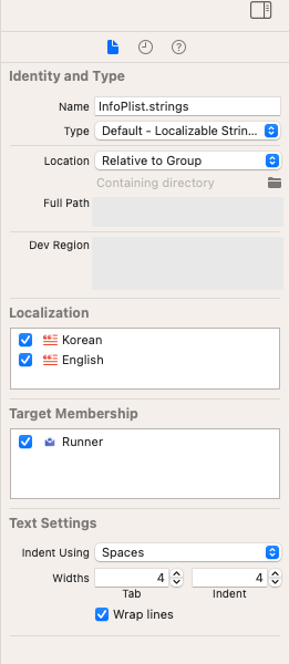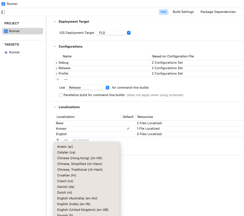 Runner > Info > Localizations에서 사용할 언어를 추가합니다.
