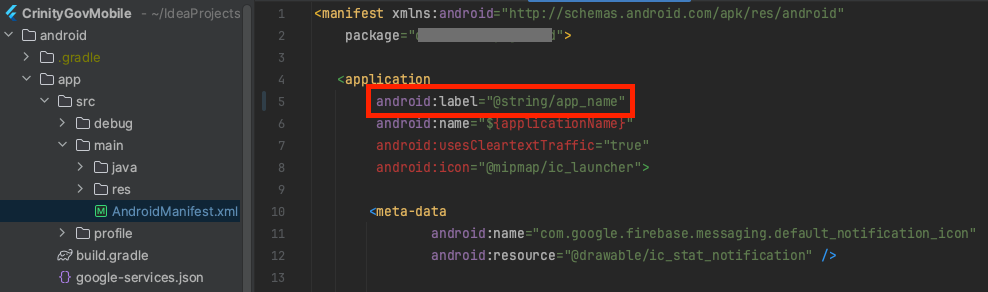 android/app/src/main/AndroidManifest.xml의 application/android:label 에 @string/app_name을 작성합니다.