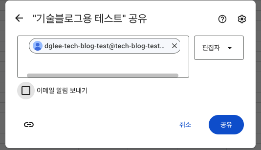 데이터를 편집할 스프레드시트를 생성하고, 위에서 생성된 계정을 해당 스프레드시트의 편집자 권한으로 공유하자.