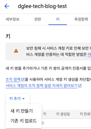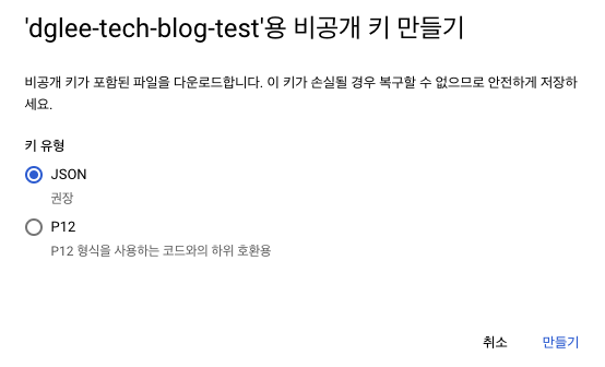 "client_x509_cert_url": "https://www.googleapis.com/robot/v1/metadata/x509/dglee-tech-blog-test%40tech-blog-test-project.iam.gserviceaccount.com",