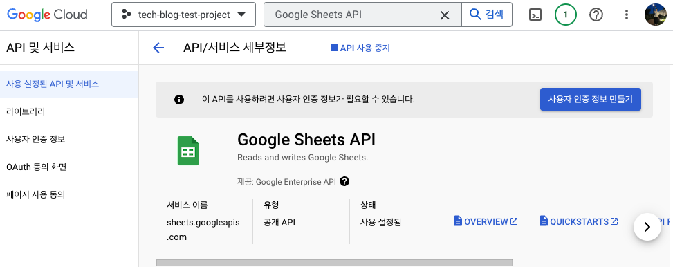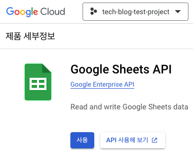 프로젝트가 생성됐다면, 검색창에서 [Google Sheets API]를 입력하여 검색 및 [사용]을 선택한다.