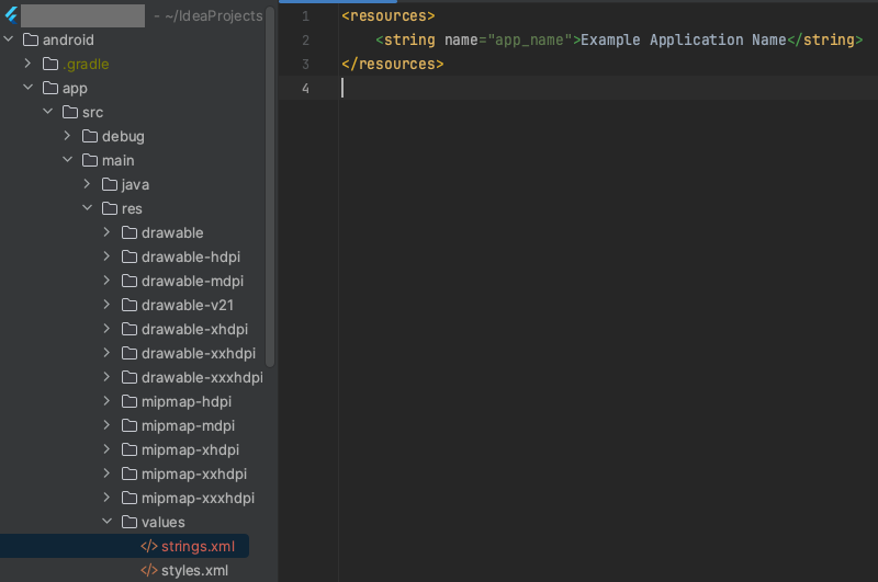 android/app/src/main/AndroidManifest.xml의 application/android:label 에 @string/app_name을 작성합니다.