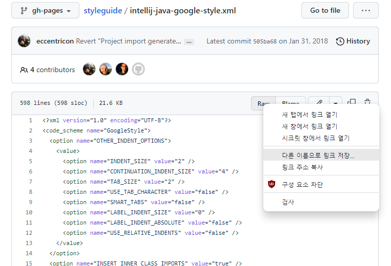 깃허브에 들어가 사용 중인 IDE의 style xml 파일이 있는지 확인합니다.