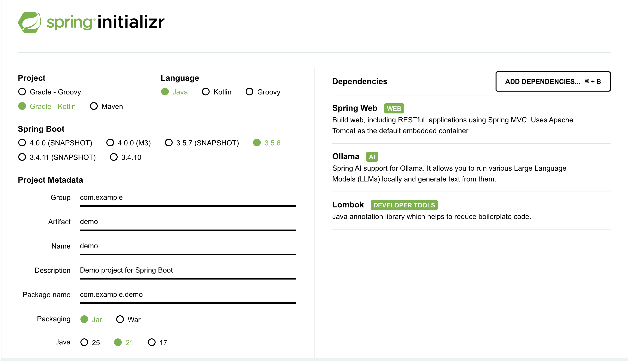 Spring Web, Ollama, Lombok을 선택하여 프로젝트를 구성했습니다.